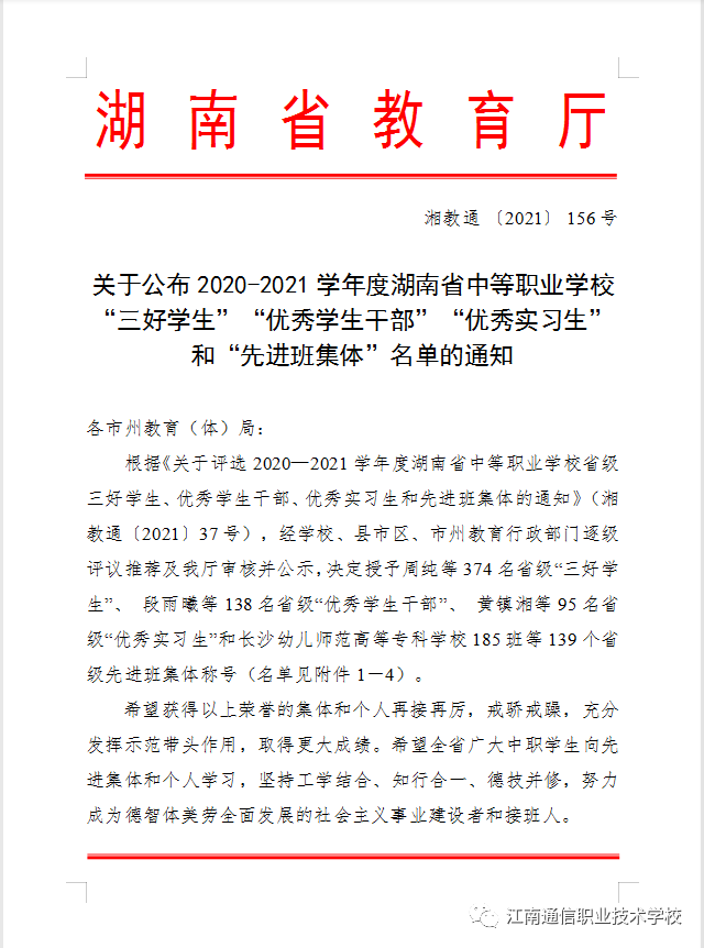 經(jīng)學(xué)校評議、推薦,岳陽市教育局、湖南省教育廳審核評定2020-2021學(xué)年度湖南省中等職業(yè)學(xué)校“省級三好學(xué)生、優(yōu)秀學(xué)生干部、優(yōu)秀實習(xí)生、先進(jìn)班級體”評選結(jié)果新鮮出爐!